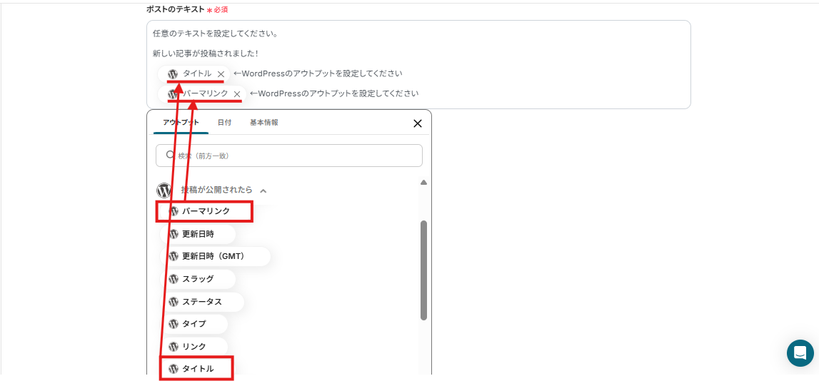 この設定により、WordPressに新規投稿があったら「タイトル」と「パーマリンク」を自動で取得し、X(Twitter)に自動で投稿することができます。