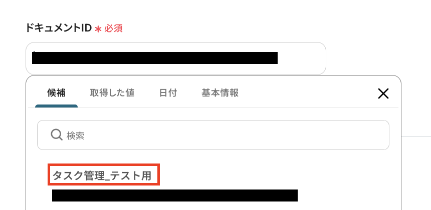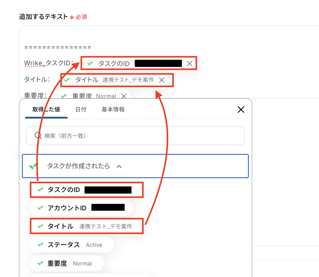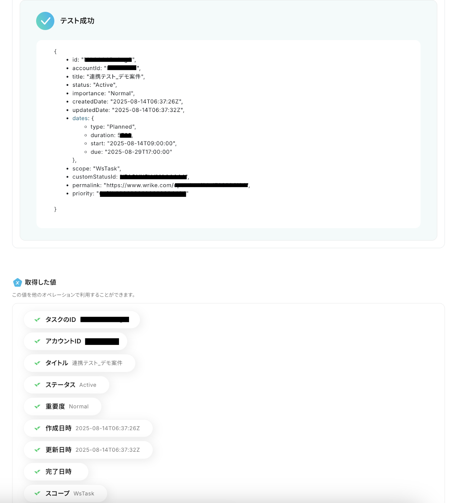 テストが成功すると、先ほど作成したタスクの情報が「取得した値」にアウトプットとして抽出されるので、内容を確認してください。