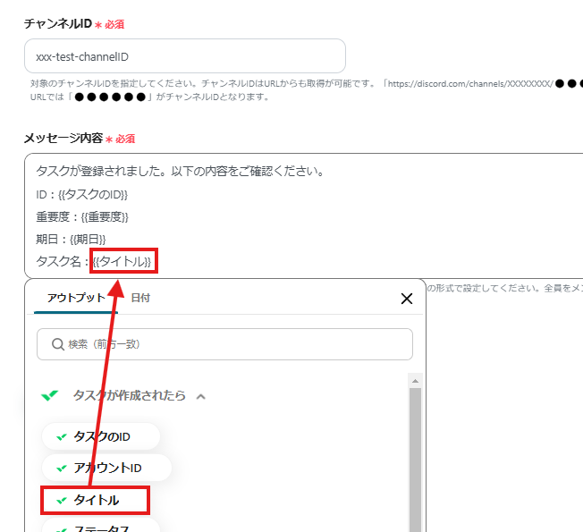 「チャンネルID」と「メッセージ内容」を入力しましょう。