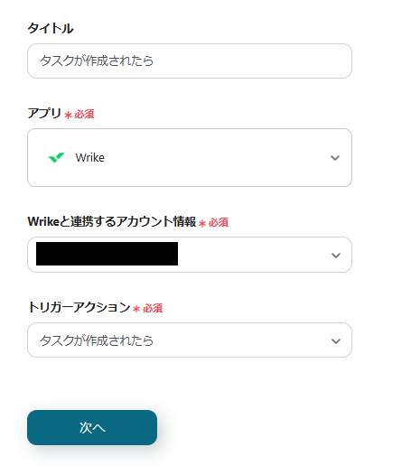 最初のページでは、事前に連携したWrikeのアカウント情報が表示されるので確認し、問題なければ、「次へ」をクリックしてください。