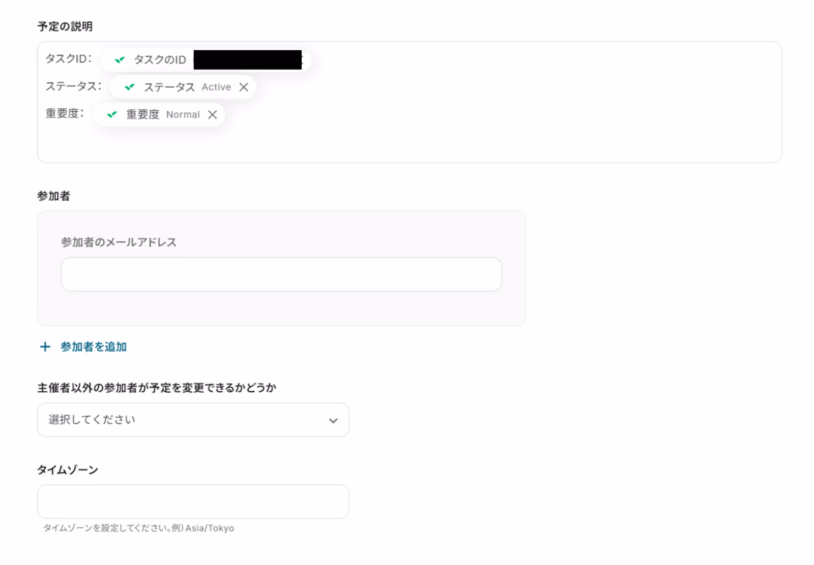 ・予定のタイトル:予定のタイトルを入力します。①のフォームで取得した値を埋め込むことも可能です。