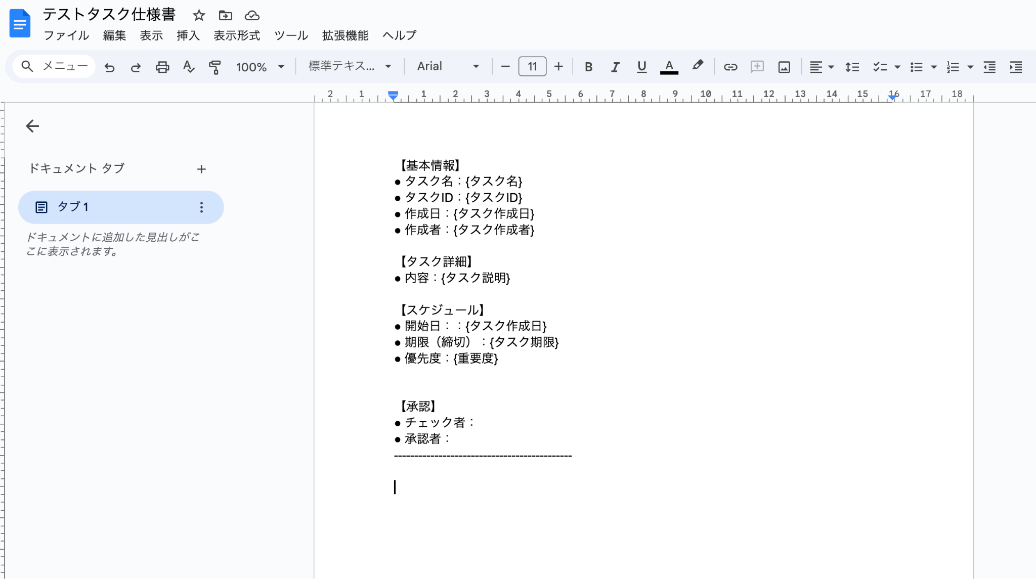 GoogleドキュメントにPDFを作成するための雛形となるドキュメントを作成しておきます。 今回は以下のようなドキュメントを使用します。 詳しくは「書類を発行する」の設定方法 をご確認ください。