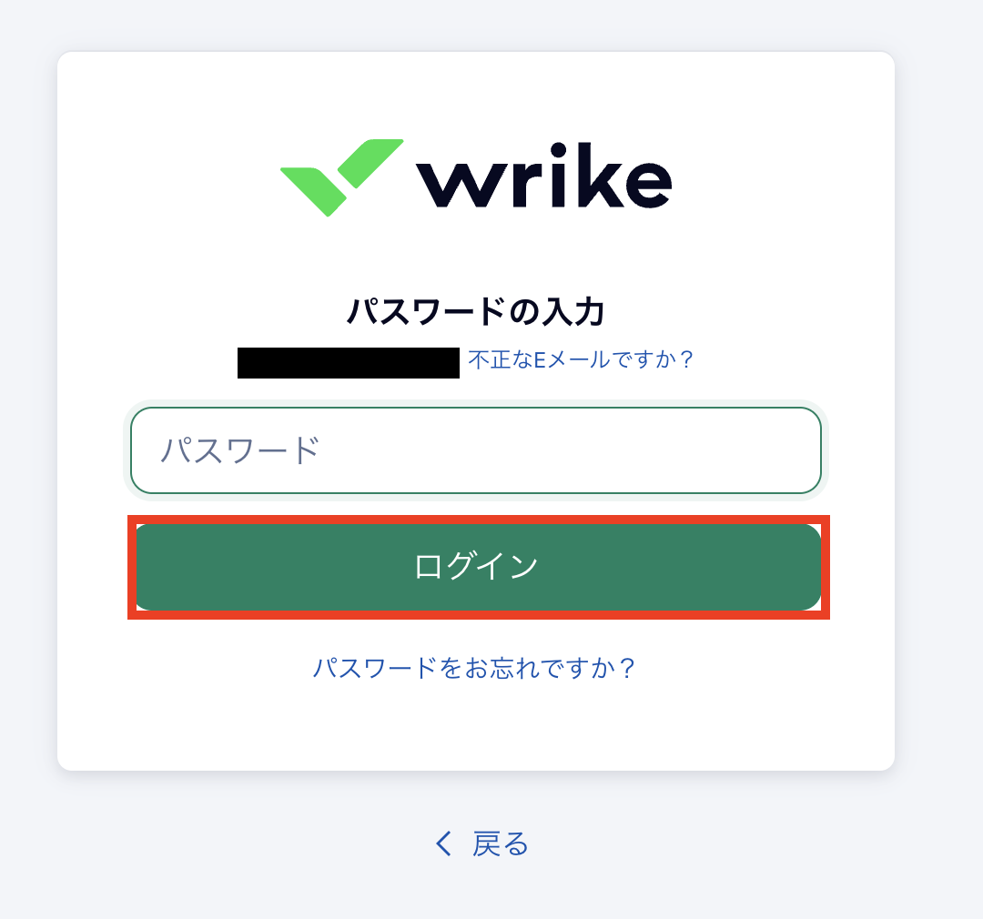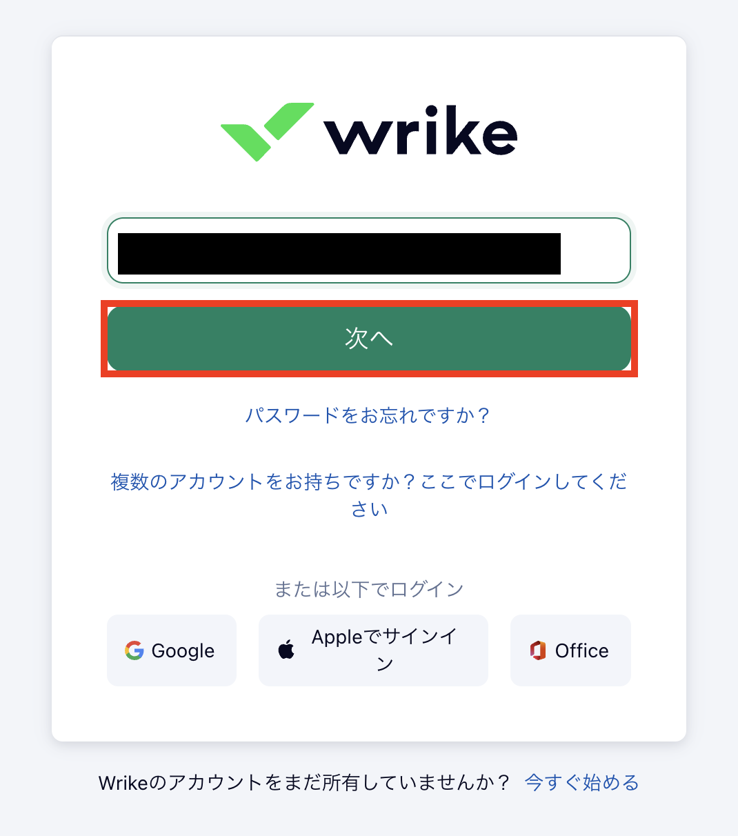 ログイン画面に移ります。Wrikeに登録しているIDを記入して「次へ」ボタンを押します。