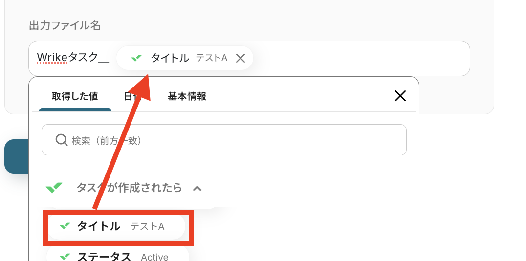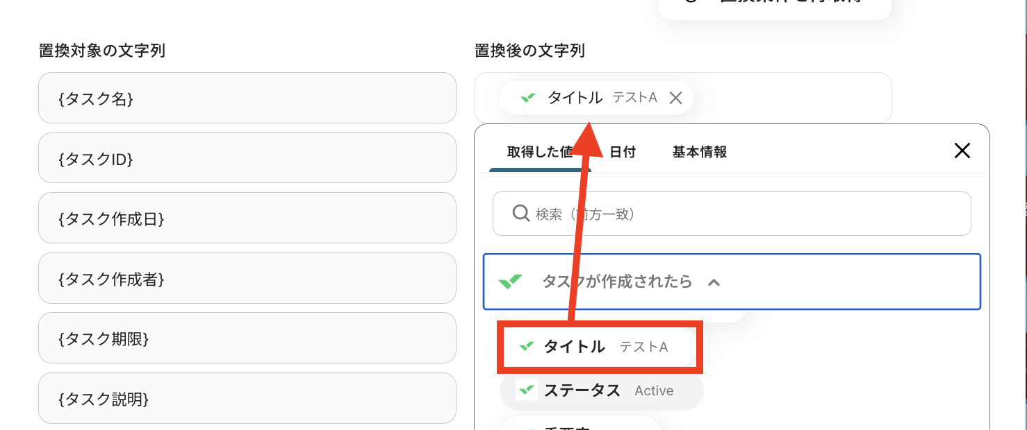 置換対象の文字列の項目を、Wrikeで取得した値を活用して設定していきます。