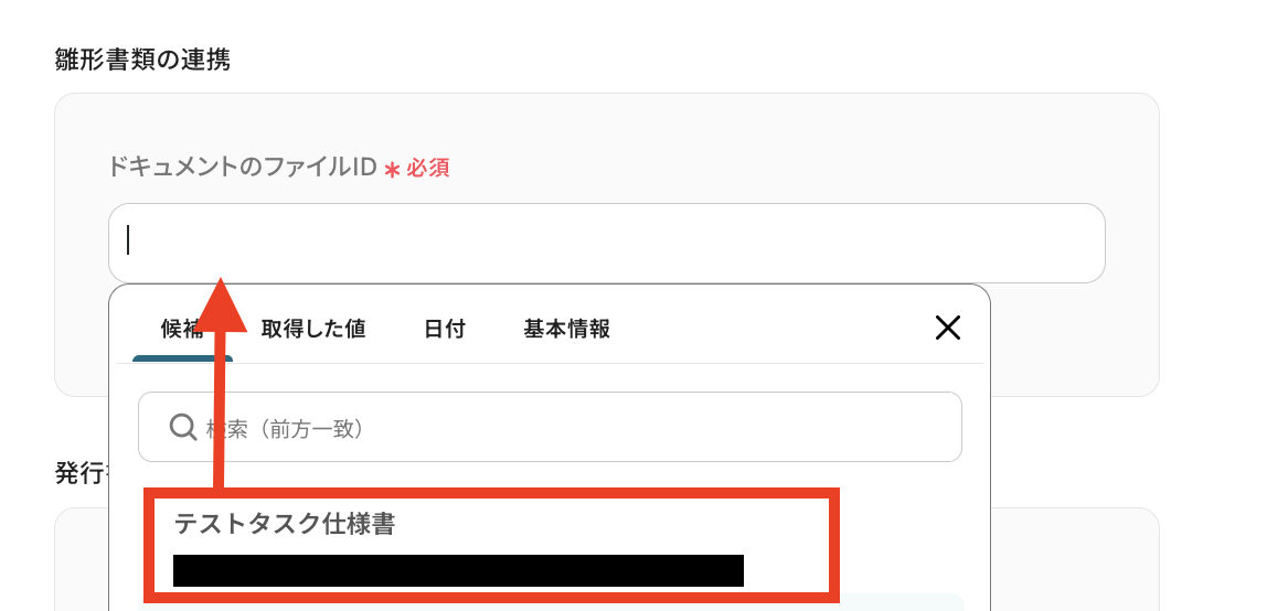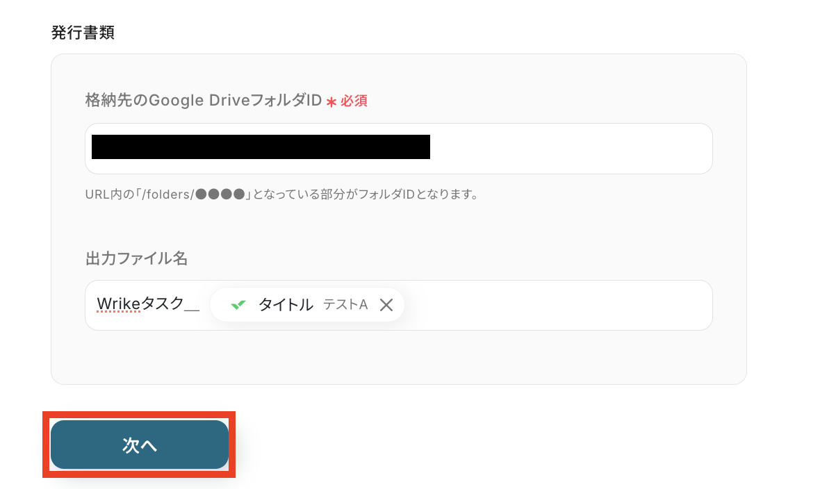 Googleドキュメントの「書類を発行する」オペレーションで、PDFのテンプレートとして使用するドキュメントのファイルIDを任意で設定してください。 発行したPDFの格納先となるGoogle DriveのフォルダIDを任意で指定してください。 出力ファイル名は、Wrikeのタスク名などの動的な情報を用いて任意に設定してください。 ■注意事項