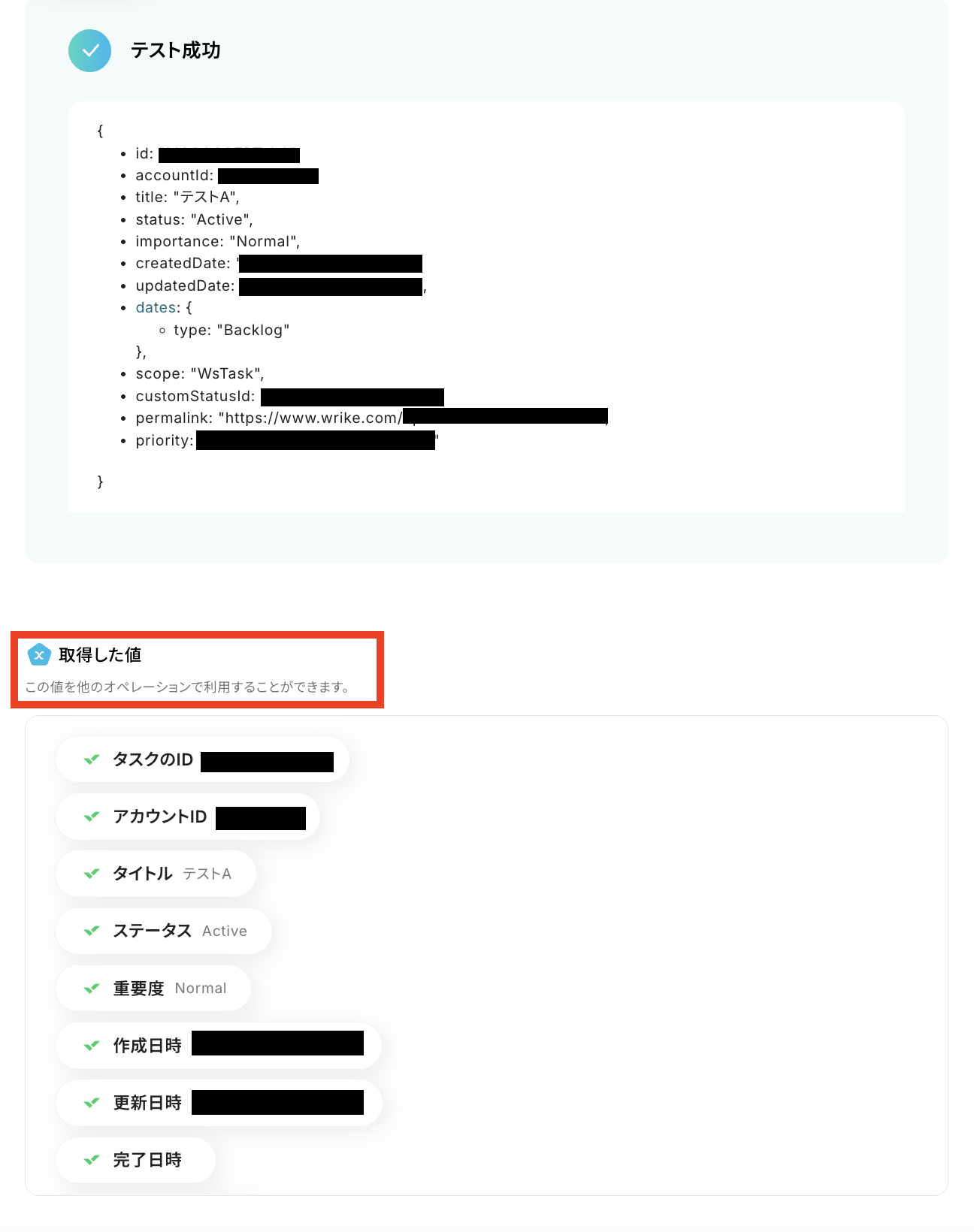 「テスト成功」と表示が出たら、取得した値 が取得されます。