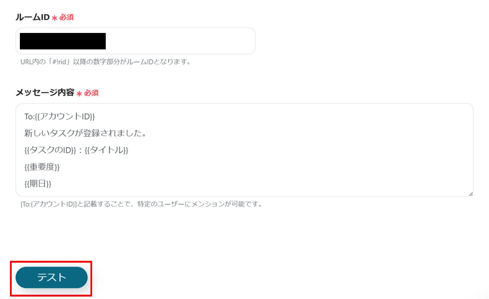 入力が完了したら、「テスト」をクリックし、エラーが発生しなければ、下部にある「保存する」をクリックします。