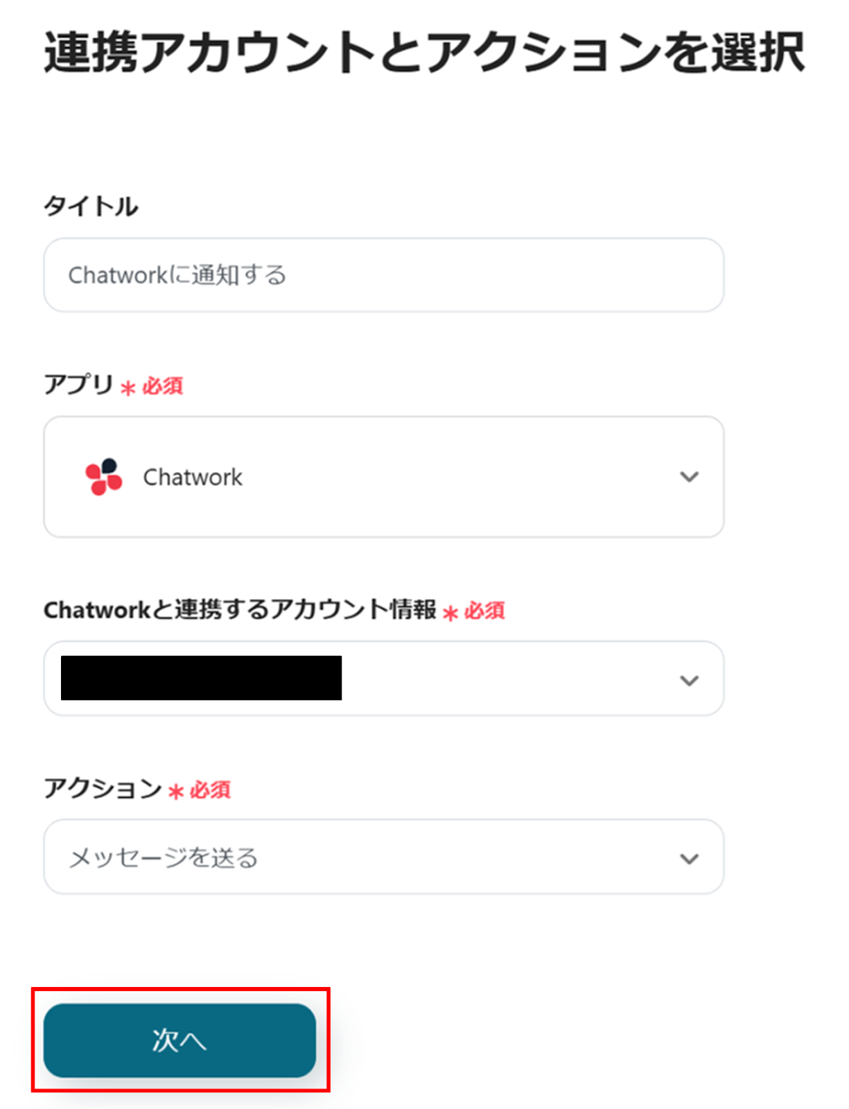 (2)Chatworkの「連携アカウントとアクションを選択」画面から、Chatworkと連携するアカウント情報に誤りがないかを確認し、アクションは「メッセージを送る」のままで「次へ」をクリックします。