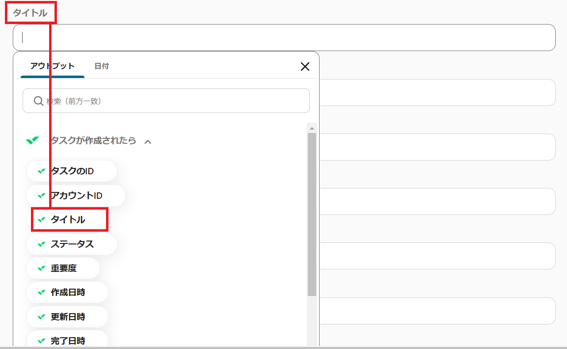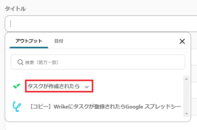 Wrikeの設定でテスト送信したタスクデータが一覧表示されます。 ボックスの項目名と等しいデータを選択しましょう。 画像の場合、ボックスの項目名が「タイトル」のため、Wrikeのデータからは同じく「タイトル」を選びました。