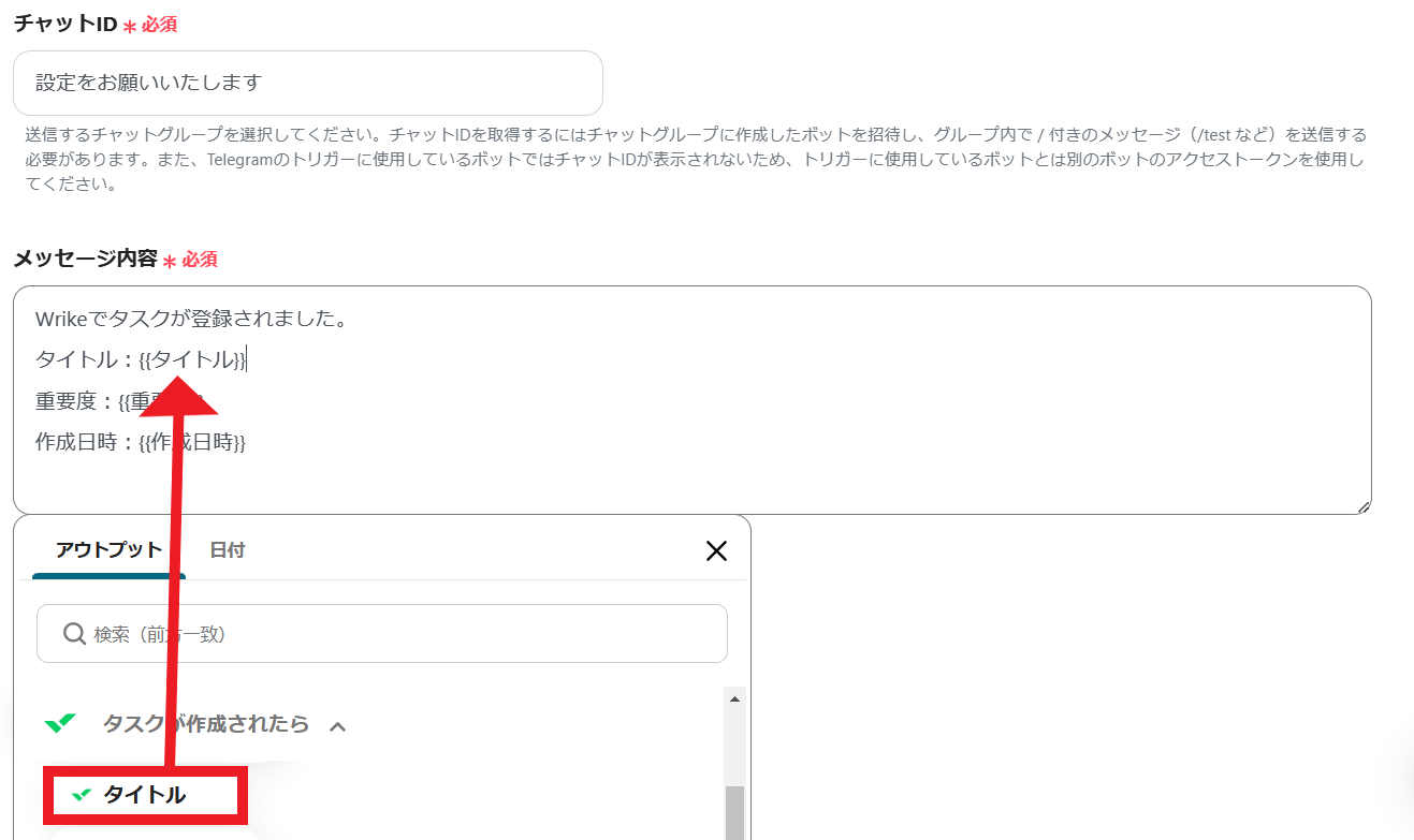 3.チャットIDとメッセージ内容を設定してください。