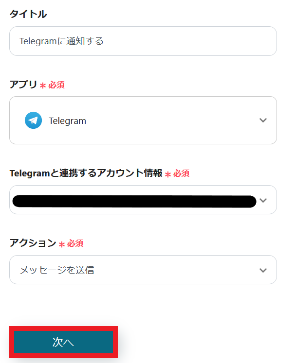 2.Telegramと連携するアカウント情報を入力します。