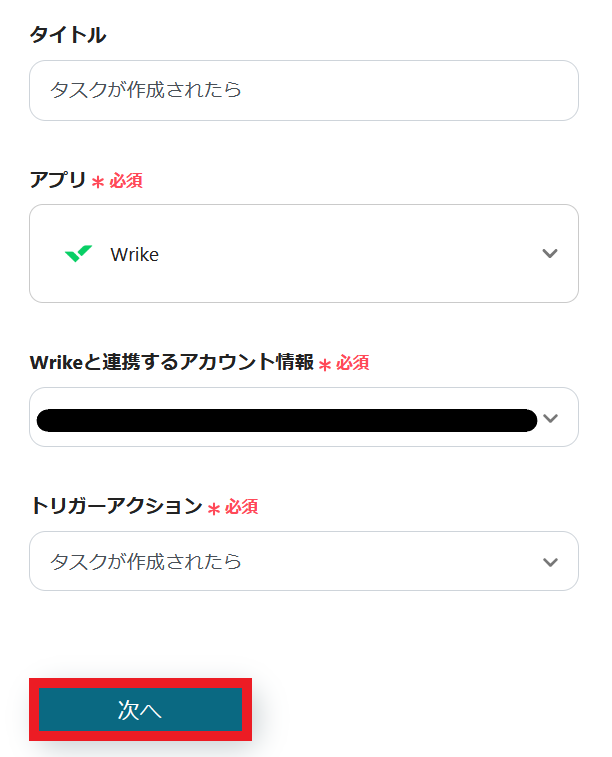 Wrikeと連携するアカウント情報を入力します。