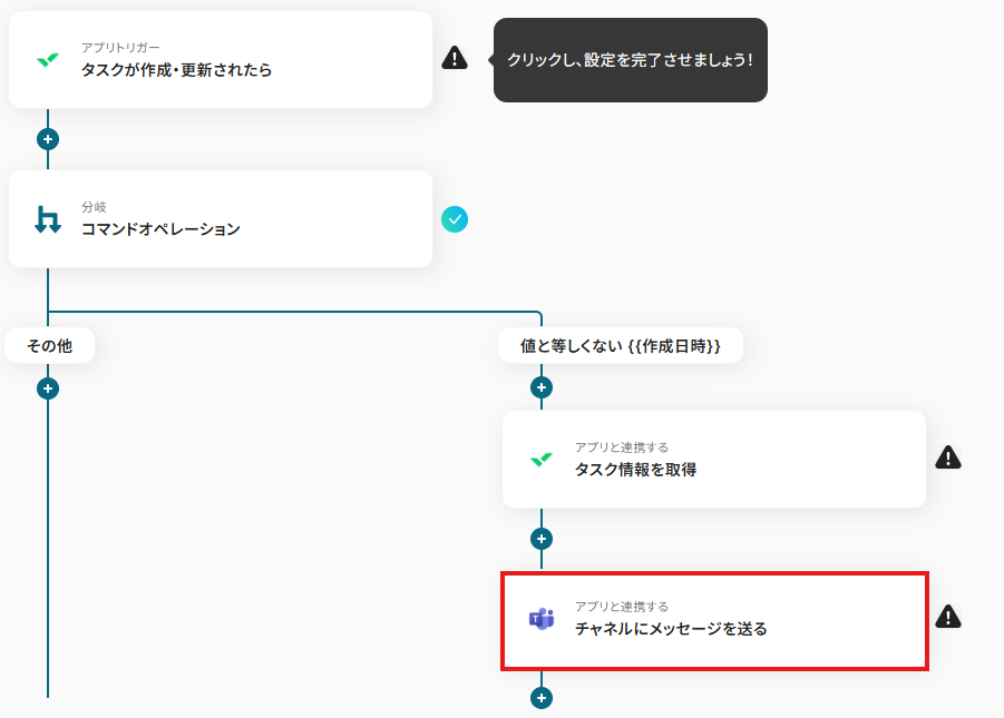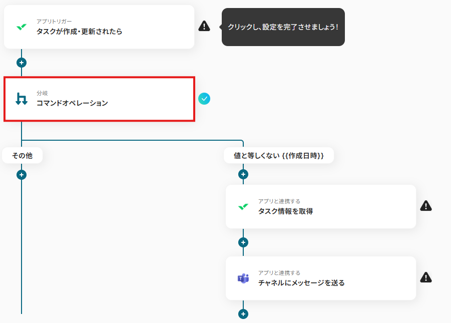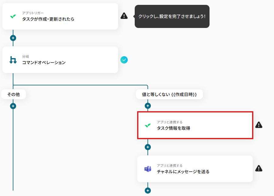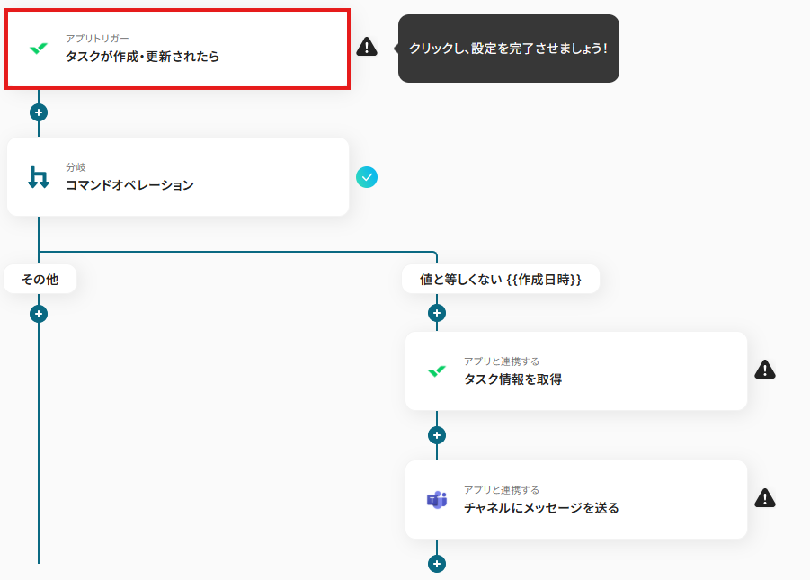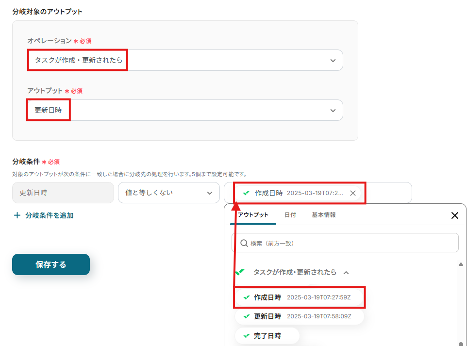 オペレーションに「タスクが作成・更新されたら」、アウトプットに検知したい項目を設定します。