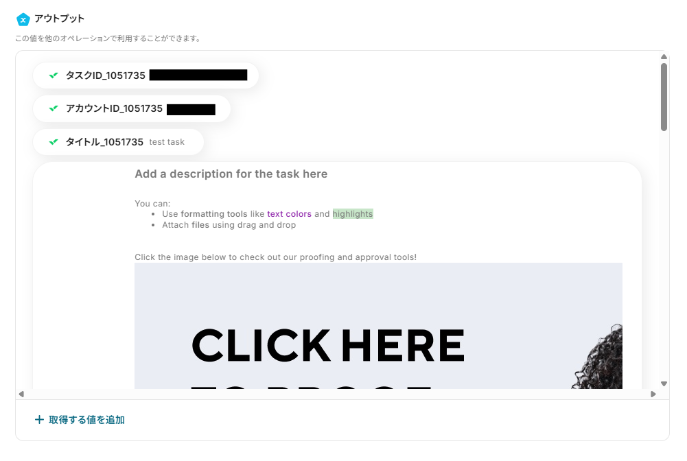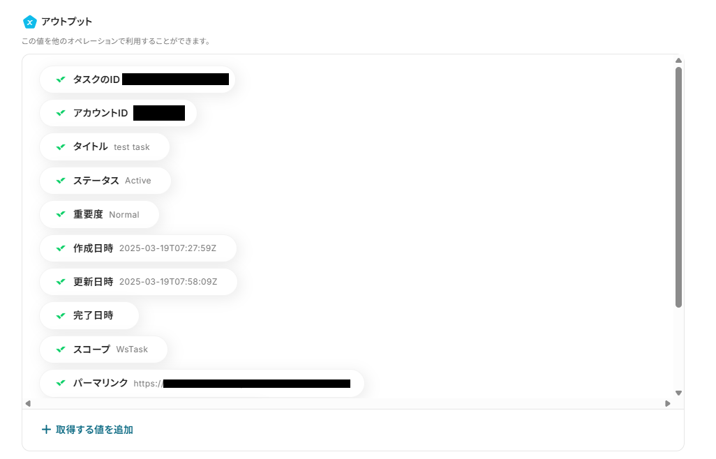 ※表示されているアウトプットは「この値を他のオペレーションで利用することができます。」と表記があるように、次の設定でも活用できます。