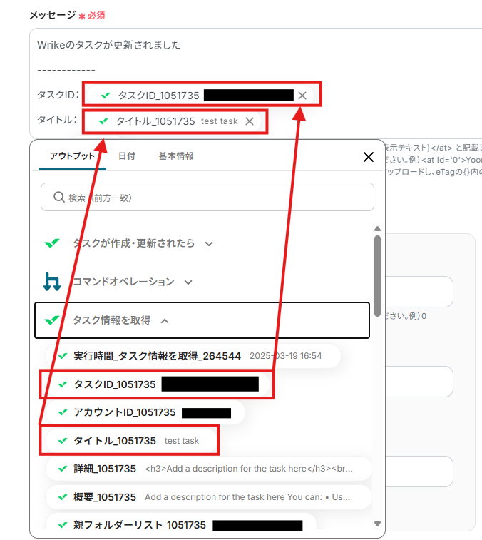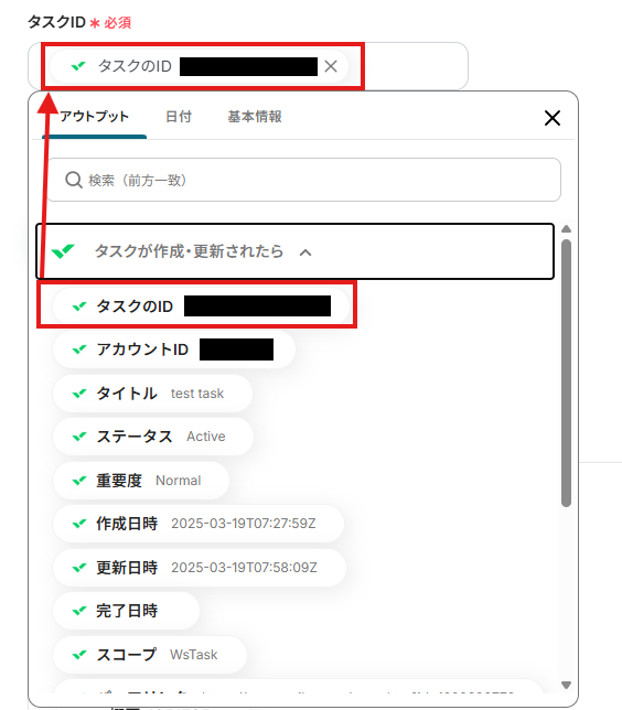 「タスクID」は、入力欄をクリックして表示されるアウトプットから選択してください。