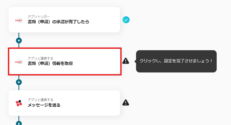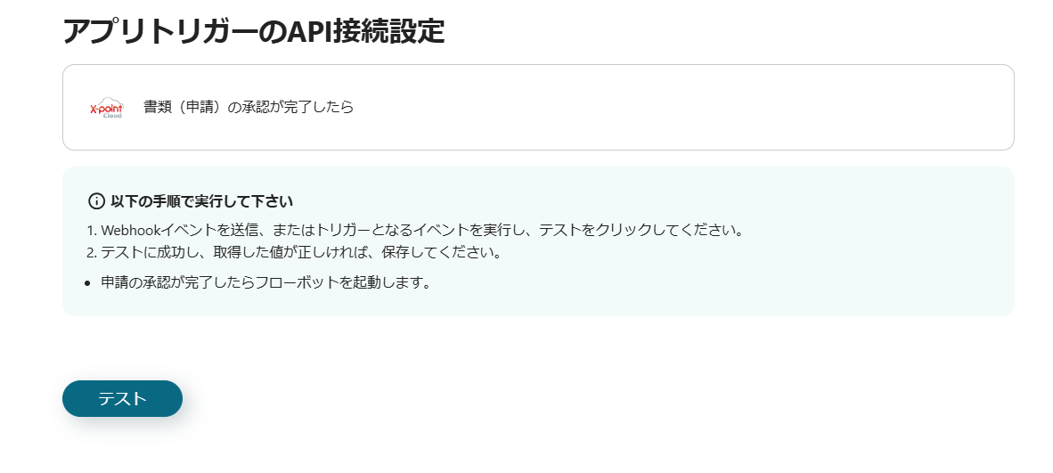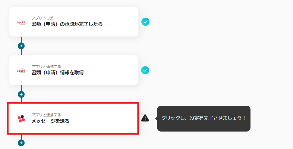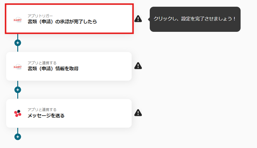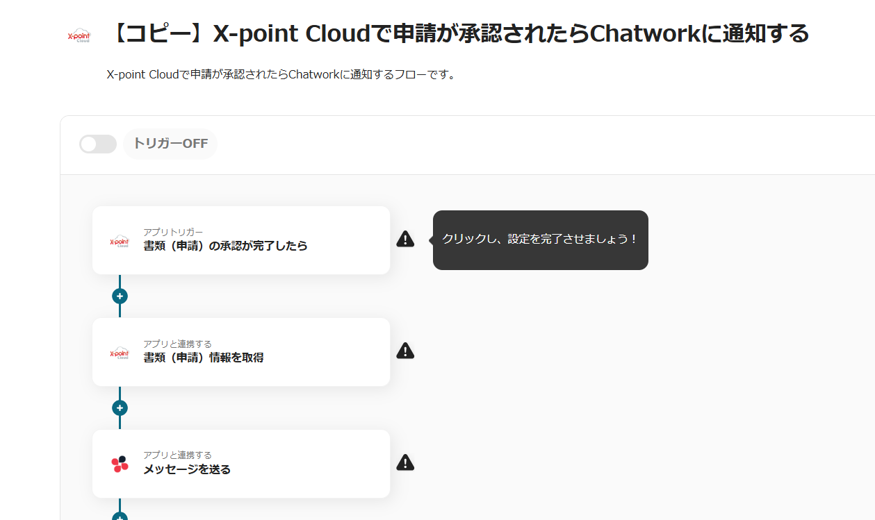 これで【X-point Cloudで申請が承認されたらChatworkに通知する】というフローが完成です。