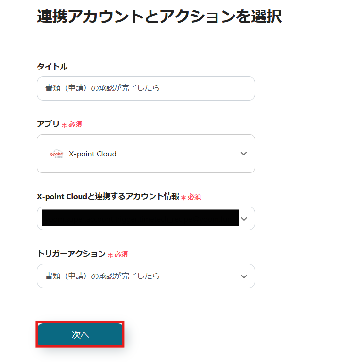 1) アクションは「書類(申請)の承認が完了したら」を選択して、「次へ」をクリックします。