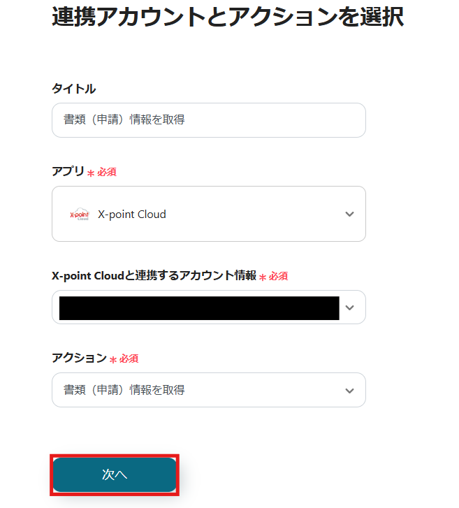 2) アクションは「書類(申請)情報を取得」を選択してデータベースIDを入力し、「次へ」をクリックします。