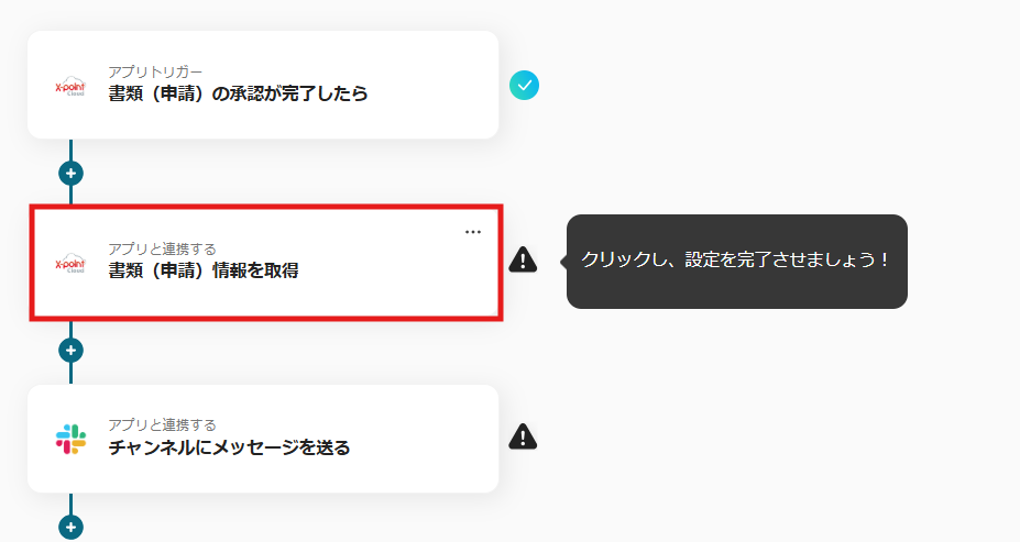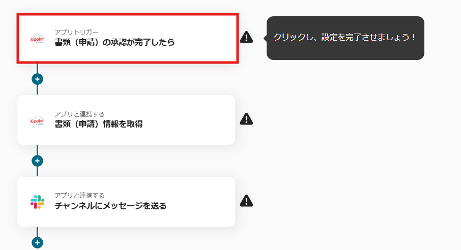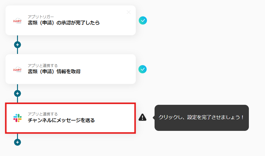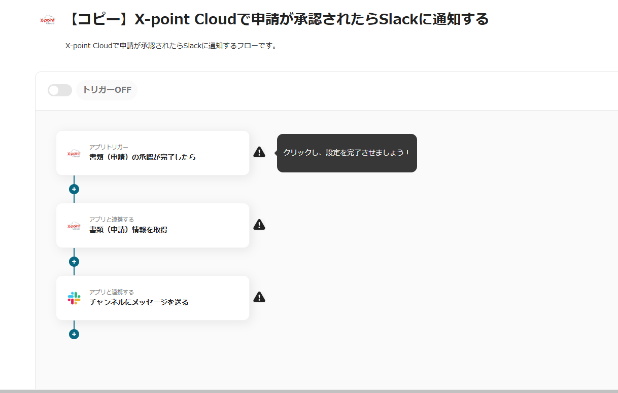 これで【X-point Cloudで申請が承認されたらSlackに通知する】というフローが完成です。