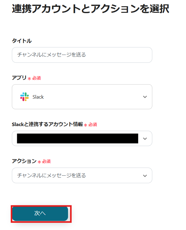 2) アクションは「チャンネルにメッセージを送る」を選択し、「次へ」をクリックします。