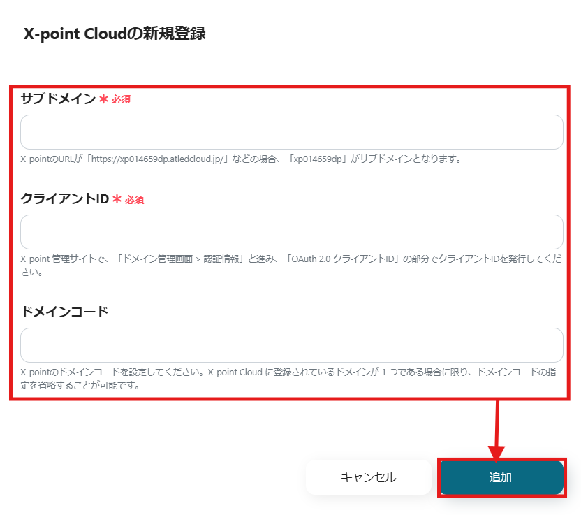 X-point Cloudを選択できたら、サブドメインとクライアントID、ドメインコードを入力し、「追加」をクリックします。