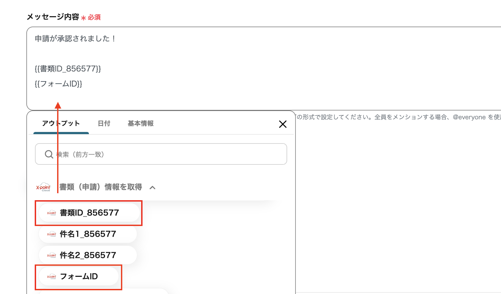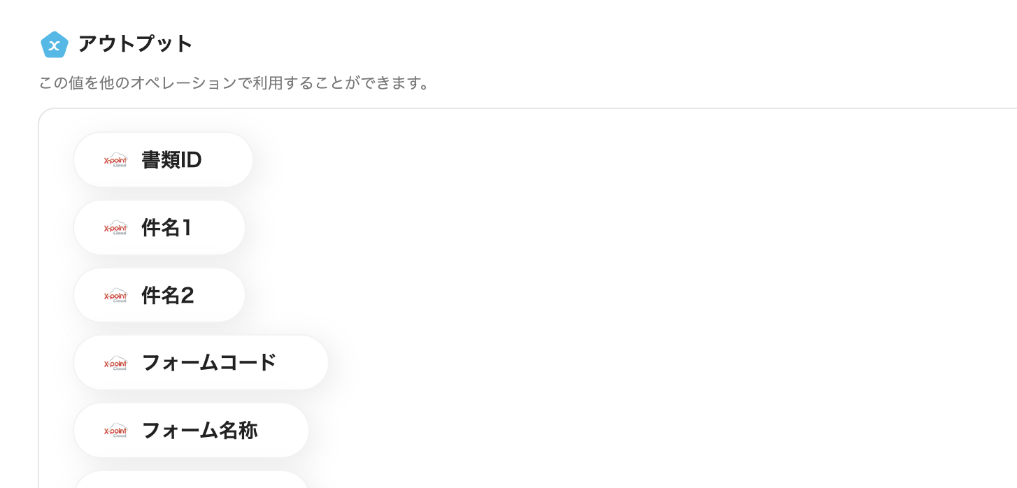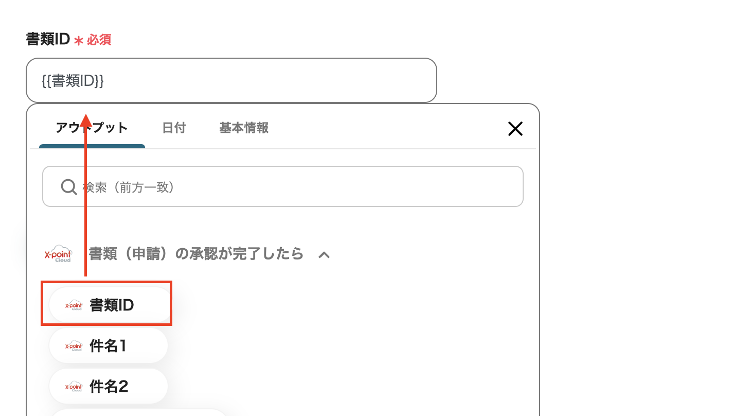 (以下は「書類ID」に前ステップで取得したアウトプット【書類ID】を引用したものです。)