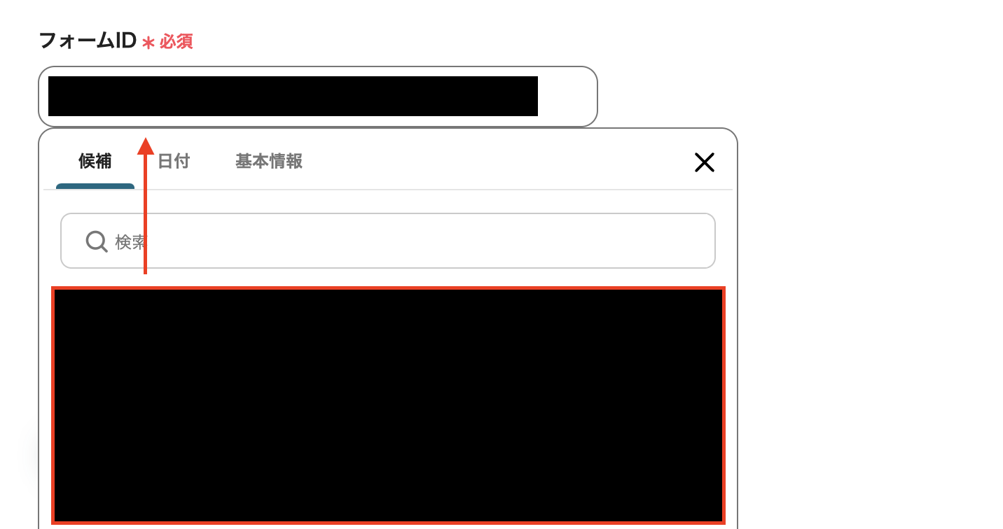 入力バーをクリックすると連携したアカウントの内容に基づいた情報が『候補』に展開されますので、該当するIDを選択しましょう。