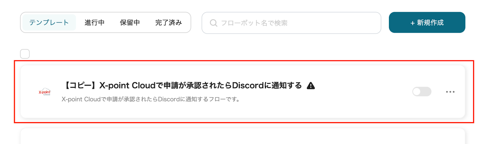 では、「X-point Cloudで申請が承認されたらDiscordに通知する」のテンプレートを使ったフローボットを作成していきましょう。