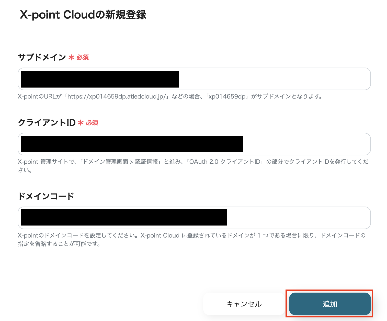 (3)「サブドメイン」と「クライアントID」、「ドメインコード」を入力し、[追加]をクリックします。