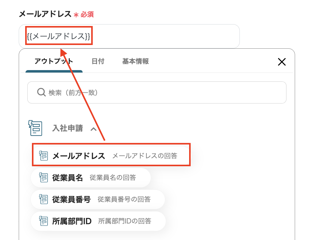 「メールアドレス」「従業員名」「従業員番号」を、入社申請フォームから取得したアウトプットを引用して設定します。
