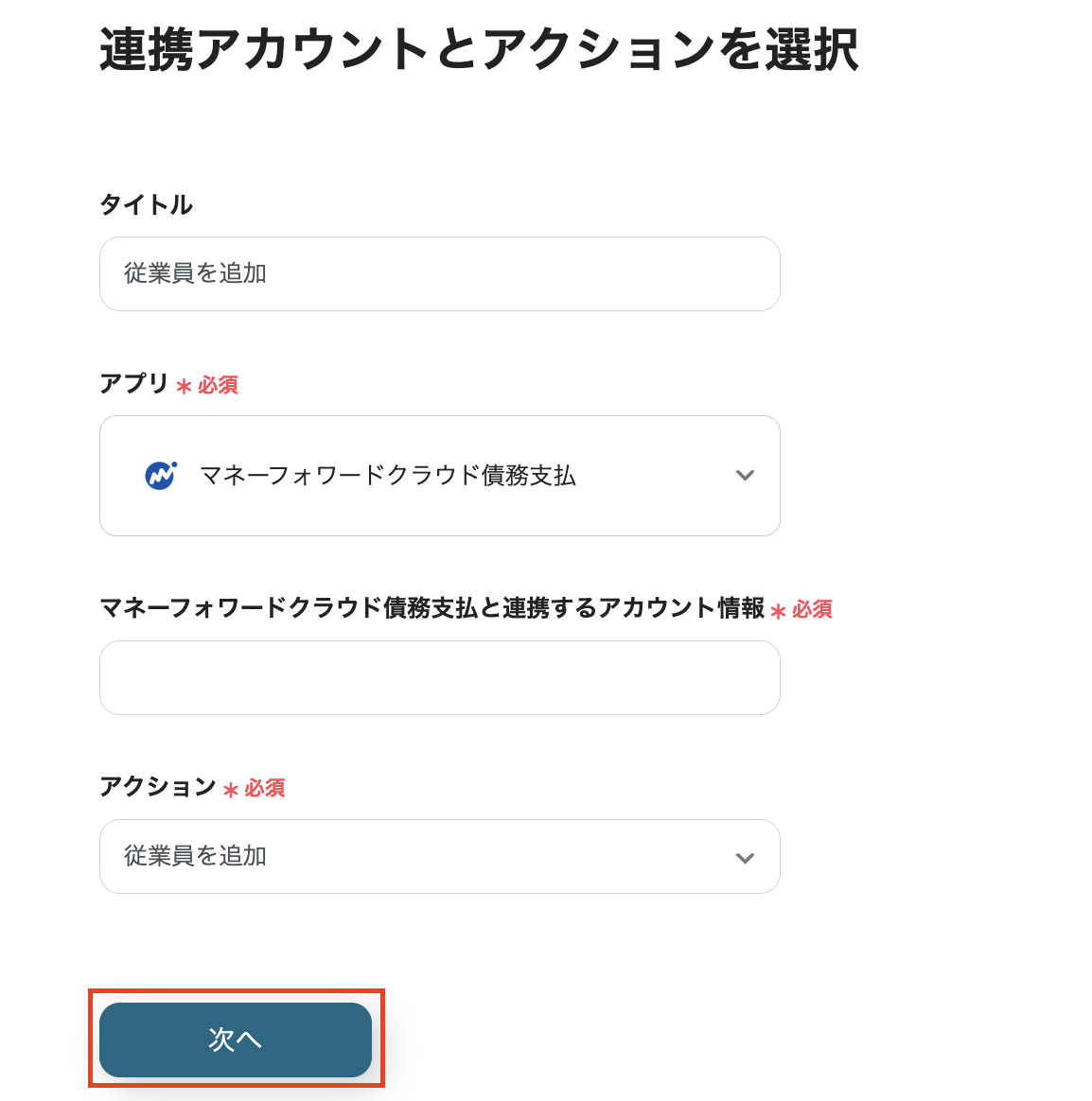 連携アカウントの設定画面が表示されるので、以下のように設定を行い、「次へ」をクリックします。