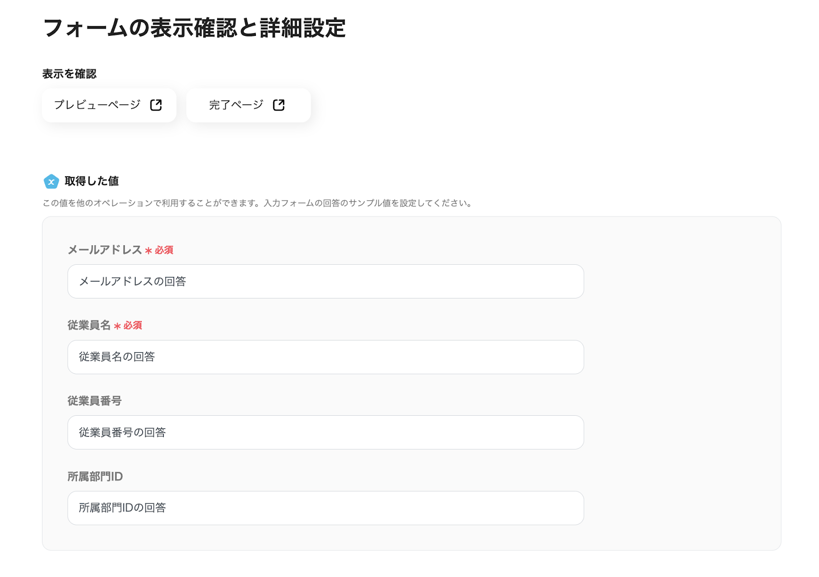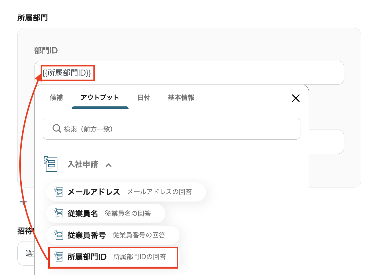 「所属部門」など、従業員ごとに異なる情報については、入社申請フォームから取得したアウトプットを引用しましょう。