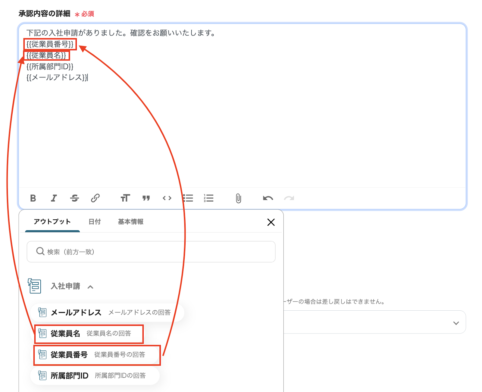 ここでは、定型文と、先ほど作成した入社申請フォームから取得したアウトプットを引用することで、入社申請ごとの内容に合わせた承認依頼を自動送信できるようになります。