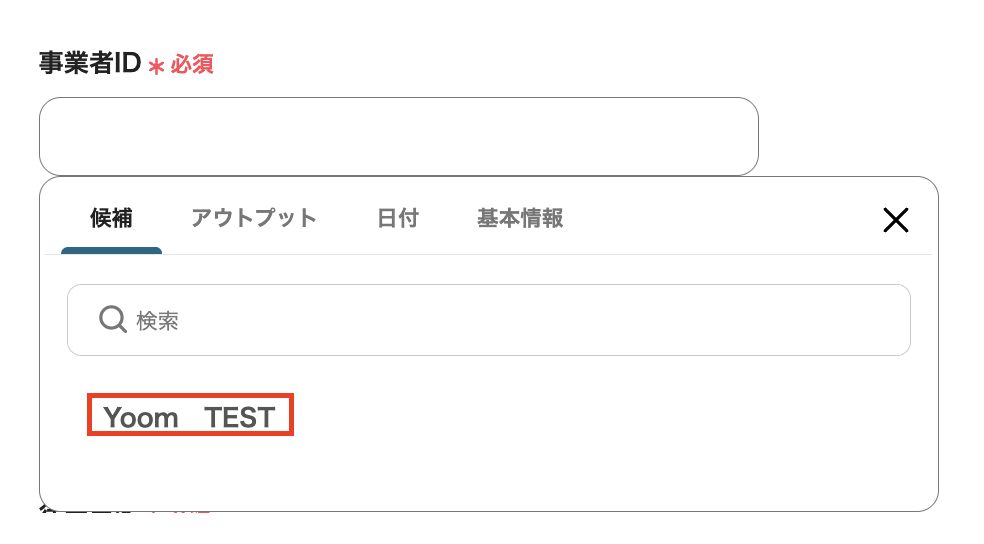 「事業者ID」欄をクリックすると、連携したアカウントから候補が表示されるので、候補から選択しましょう。