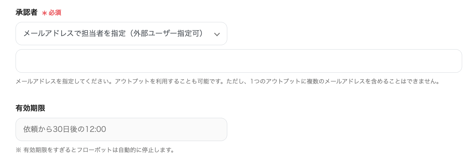 Yoomに登録していない外部ユーザーに、メールアドレスで承認者を指定したい場合は、こちらを選択します。この場合、承認依頼から30日後の12:00までに承認が行われないと、自動的にフローボットが停止される有効期限が設定されているので、注意してください。