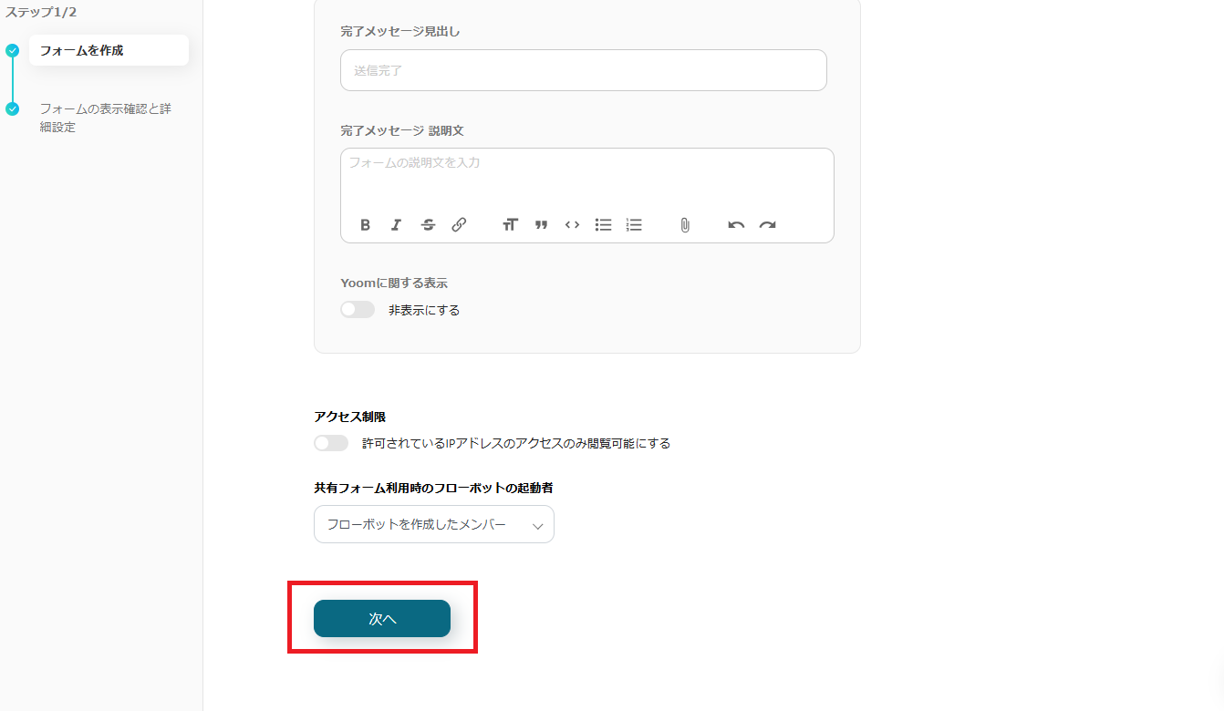 収集したいユーザー情報に合わせてフォームと完了ページの内容を入力し、「次へ」をクリックしてください。
