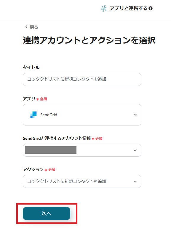 「連携アカウントとアクションを選択」の画面が表示されるので、今回連携するSendGridのアカウントに間違いがないことを確認し「次へ」をクリックします。