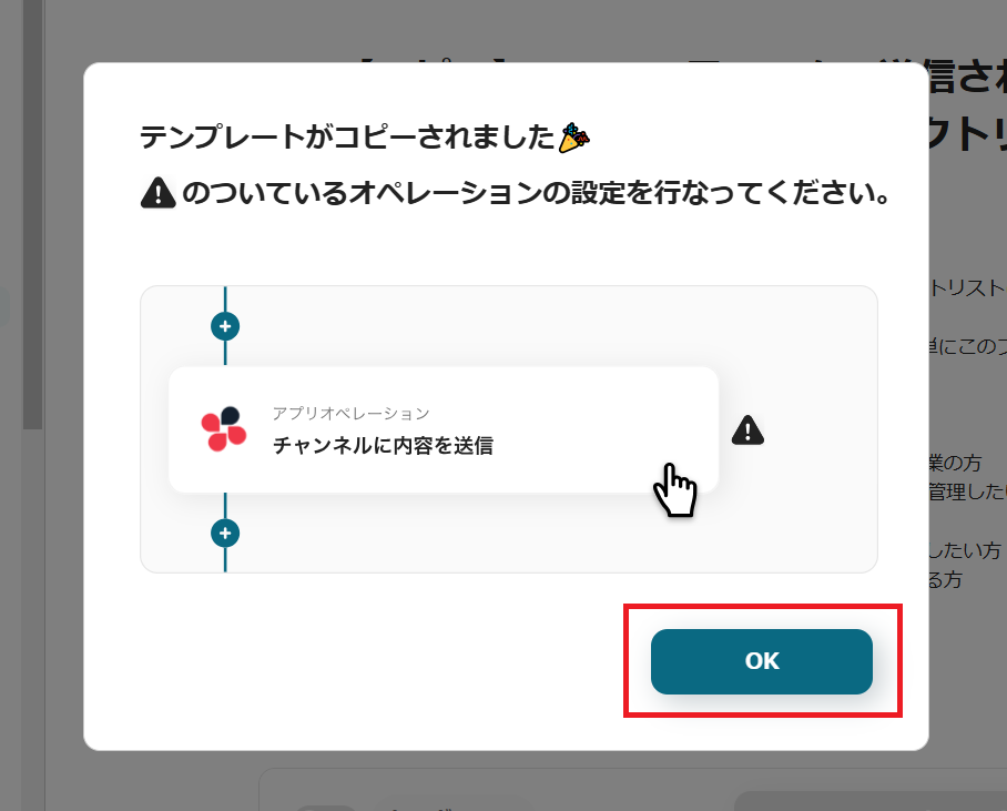 「テンプレートがコピーされました」と表示されるので、「OK」をクリックしてください。