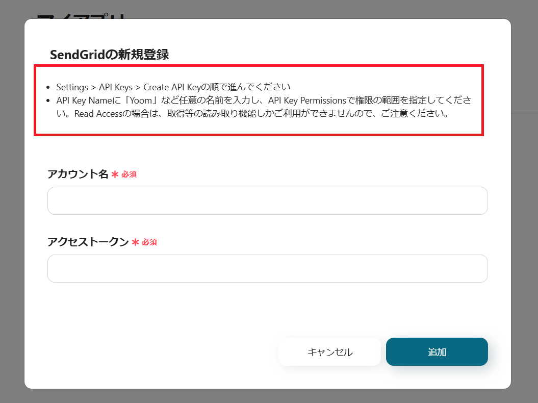 入力後に右下の「追加」をクリックすると、SendGridのマイアプリ連携が完了します。