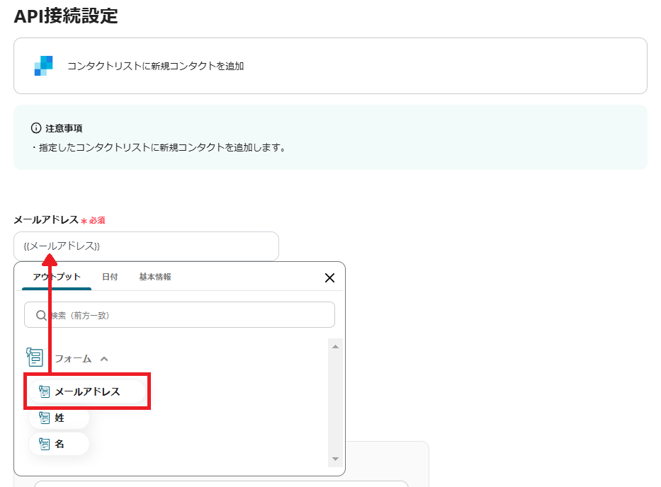 メールアドレス等の各項目のテキストボックスをクリックすると、STEP3で取得したアウトプット情報が表示されます。