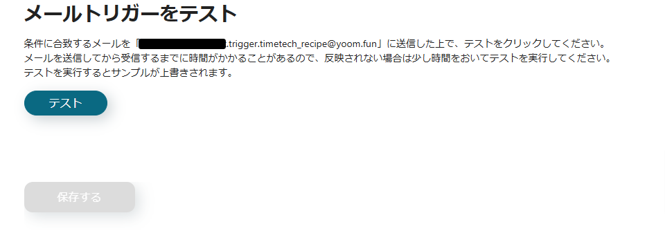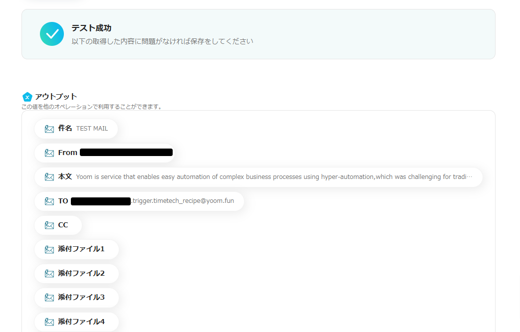 仮のメールを指定したアドレス宛に送信し、テストが成功するとアウトプットが取得できます。