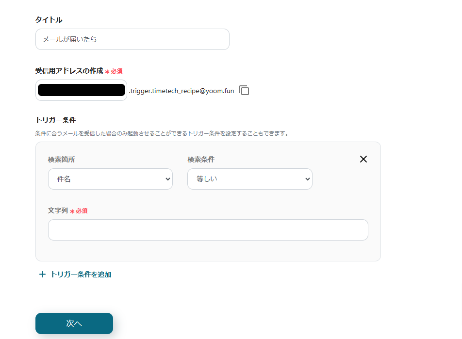 どのメールアドレス宛にメールが届いたら、フローが動くのかを設定します。