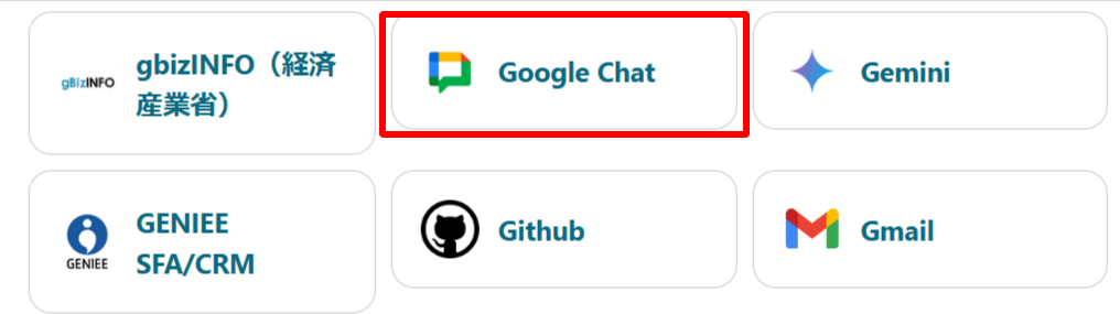 「マイアプリの新規接続」のウィンドウが表示されたら、Google Chatを検索して表示内容に沿って入力を進めていきます。