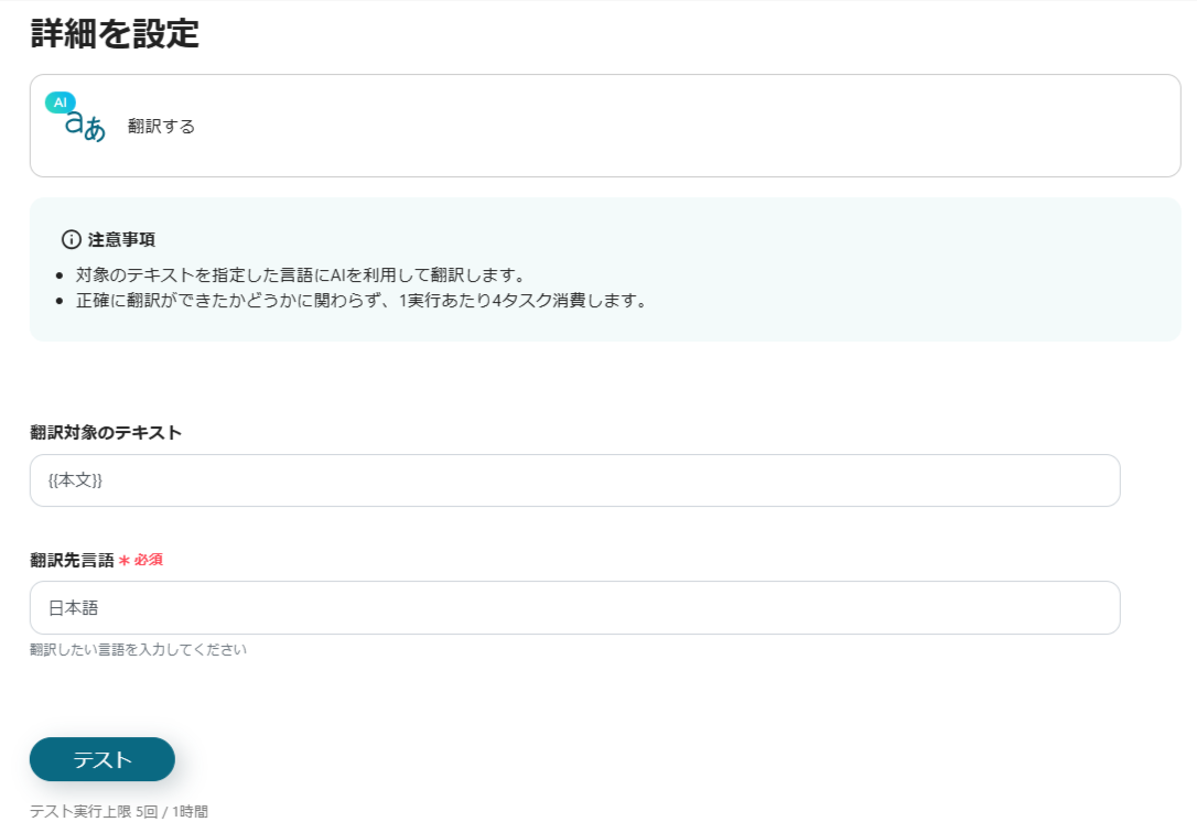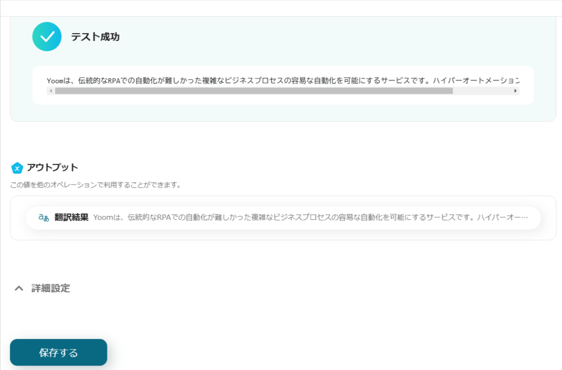 テストをクリックし、成功すると翻訳内容がアウトプットで取得できます。