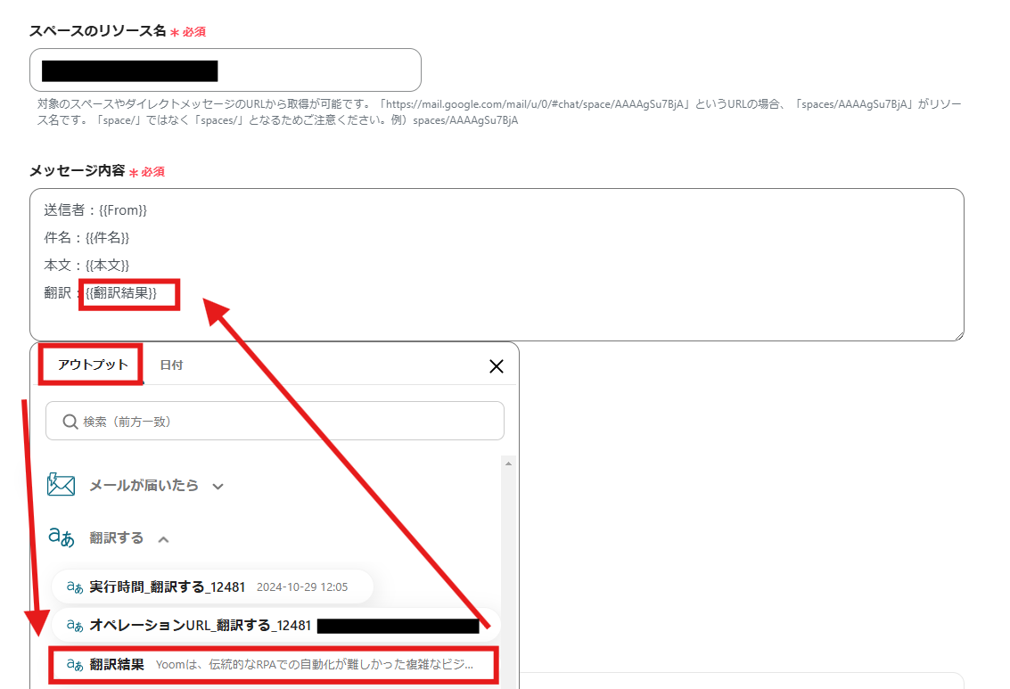 メッセージ内容は、アウトプットを活用して入力できるので上記画像を参考に入力してください。