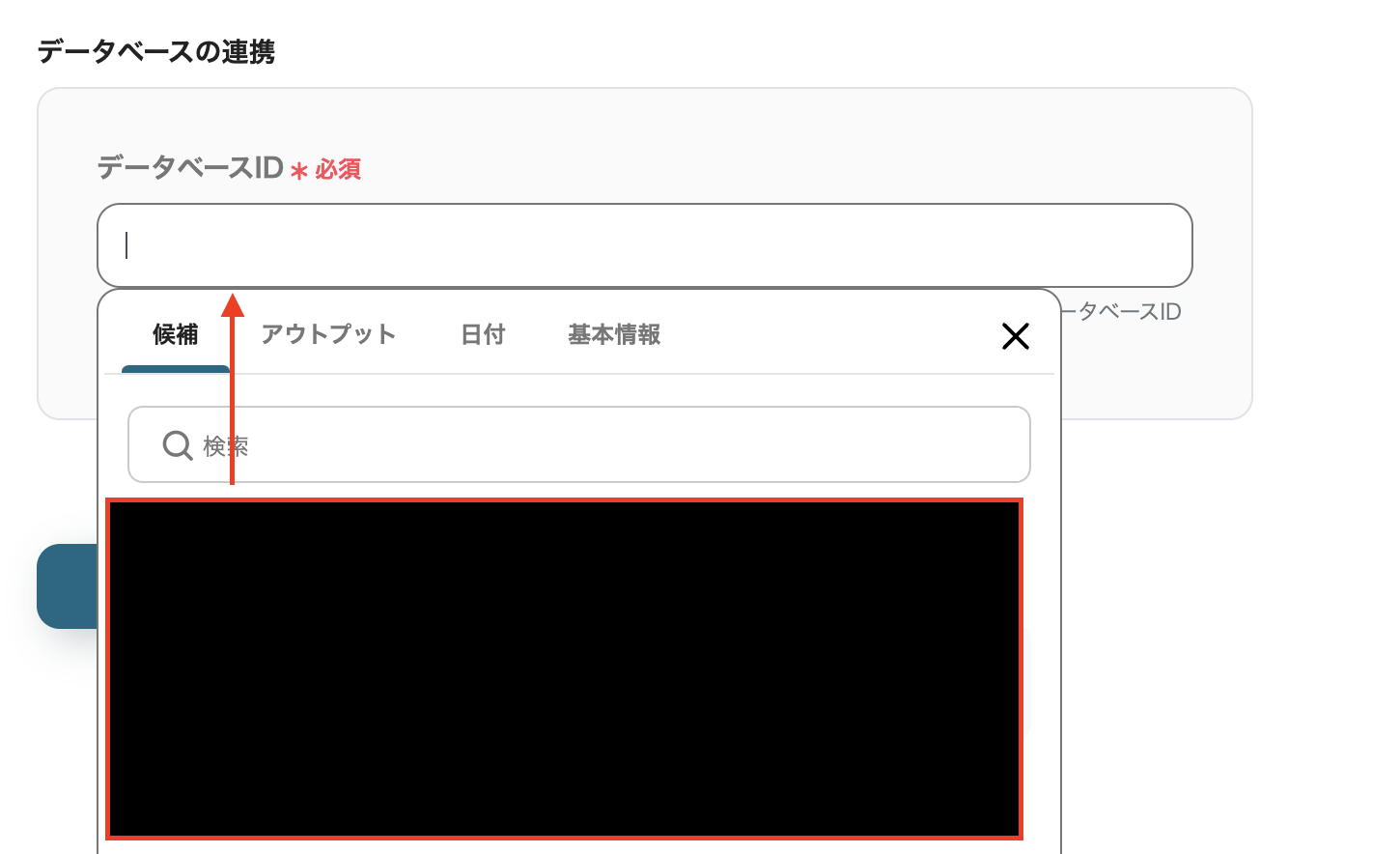 「データベースID」は、入力バーをクリックすると、連携したアカウントの内容に基づいた情報が展開されるので、フローに設定したいIDをここから選択することもできます。