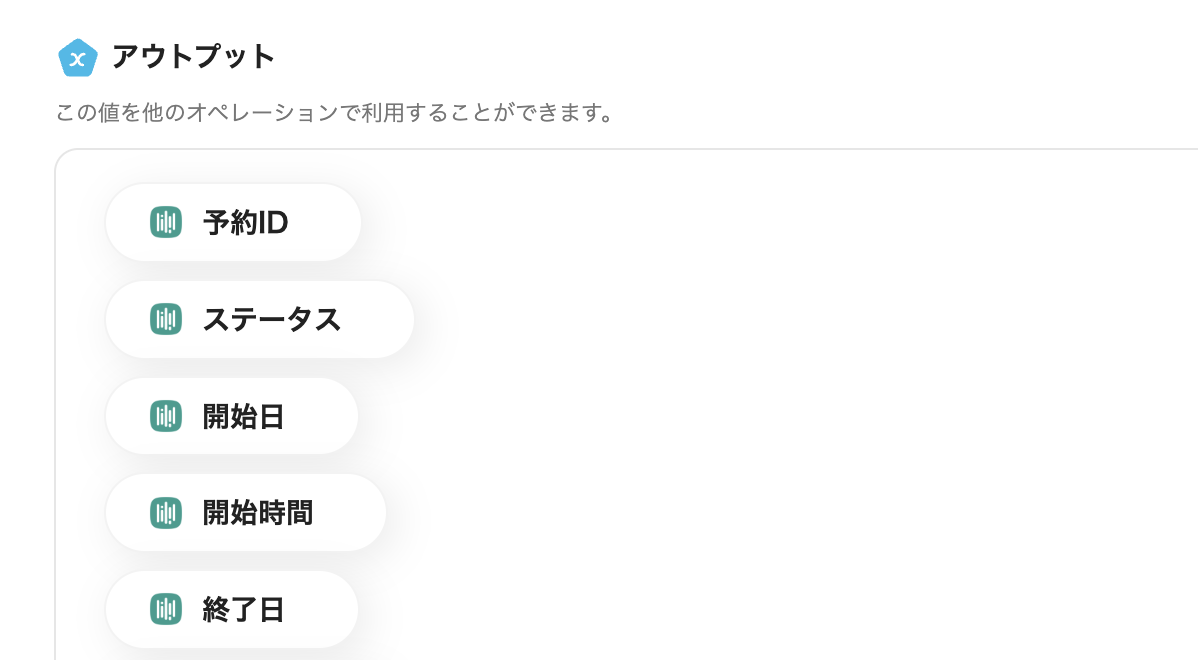 アウトプット情報は、「この値を他のオペレーションで利用することができます。」という注釈の通り、この後のステップで引用・活用できます。