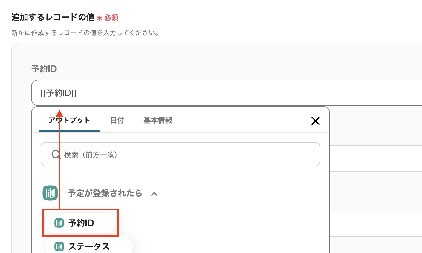 (以下は例として、「予約ID」の項目に前ステップで取得した【予約ID】の情報を引用したものです。)