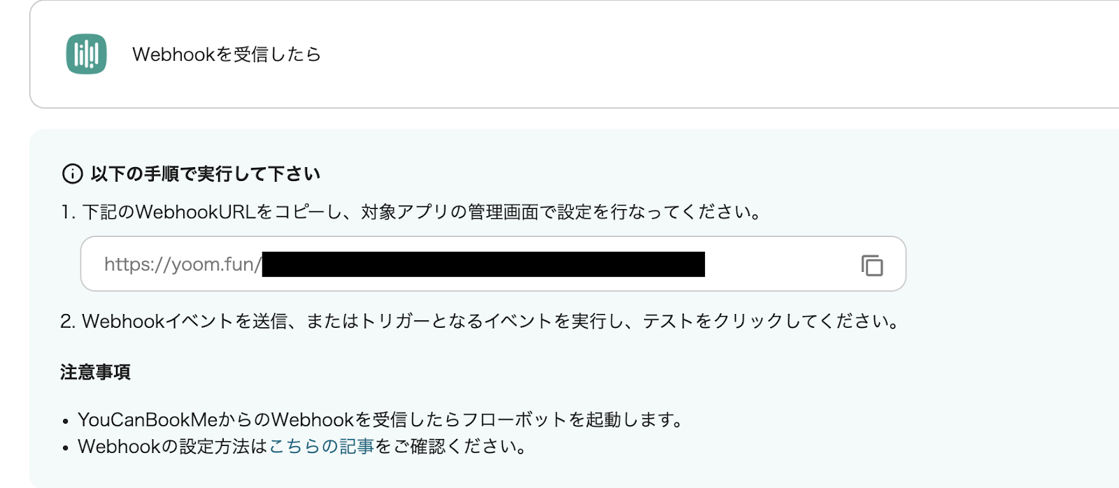 (4)次の画面では表示されたWebhookURLをコピーし、YouCanBookMeの管理画面で設定を行なう必要があります。