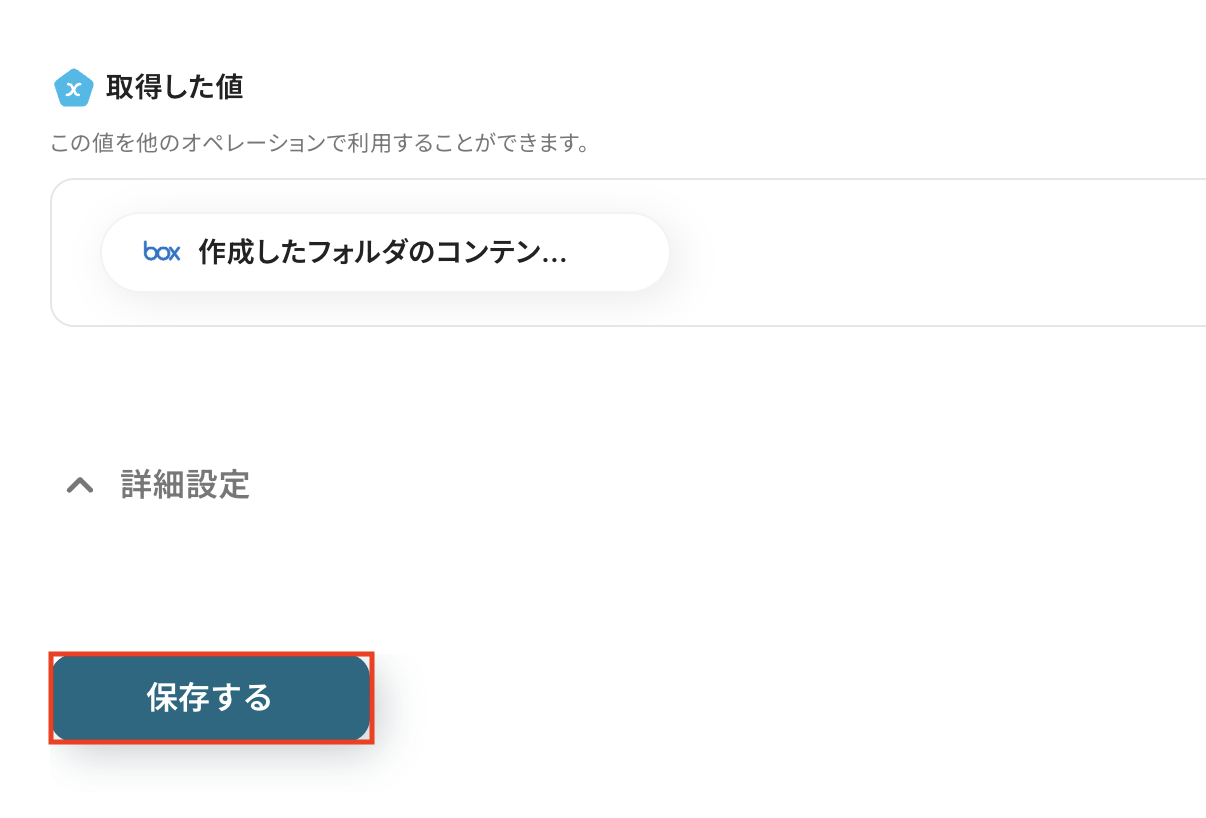 以下の画像の取得した値(=アウトプット)を使用して、Boxへフォルダの作成が可能です。